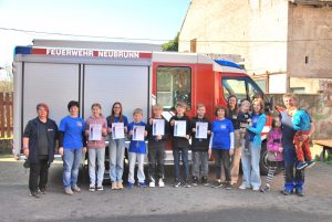 Am Samstag, den 05.04.2025 fand die Abnahme der Kinderflamme Stufe 3 unserer Kinderfeuerwehr in Neubrunn statt. Die Aufgaben waren: Das Verbrennungsdreieck erklären, mit einem D-Strahlrohr drei Tennisbälle von Verkehrsleitkegeln spritzen, das Verhalten bei Verbrennungen, zu zweit einen Tischtennisball durch einen C-Schlauch bringen und noch einen Fragebogen mit 10 Fragen ausfüllen. Alle 6 Kinder haben die Aufgaben fehlerfrei erfüllt. Das waren: Lian Preller, Lukas Knab, Anne Holzmann, Vincent Möller, Maria Knab und Jonas Rocho. Als Kreiskinderfeuerwehr-Beauftragte hat die Prüfung Susanne Eckl überwacht und die Urkunden und Anstecknadeln überreicht. Anschließend gab es mit den Familien noch etwas Kleines zu Essen und auch die Geschwister durften sich an den Feuerwehraufgaben versuchen. Ganz vielen Dank an den Betreuerinnen Nicole Kandler, Henriette Holzmann, Jessica Schuhmann, Simone Holzmann und den Betreuer Pierre Rocho für die Ausbildung und Vorbereitung!